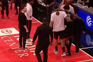 希望没事啊!小德里克·琼斯被杰伦·布朗扑倒 被搀扶回更衣室