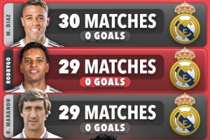 皇马队史连续球荒榜: